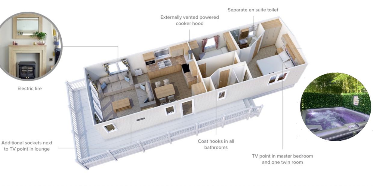 This super modern 2020 model, 6 berth ABI Beverley mini lodge is conveniently located near the parks entrance. Brimming with mod cons, it comes complete with a huge private square balboa hot tub and private decking area.
